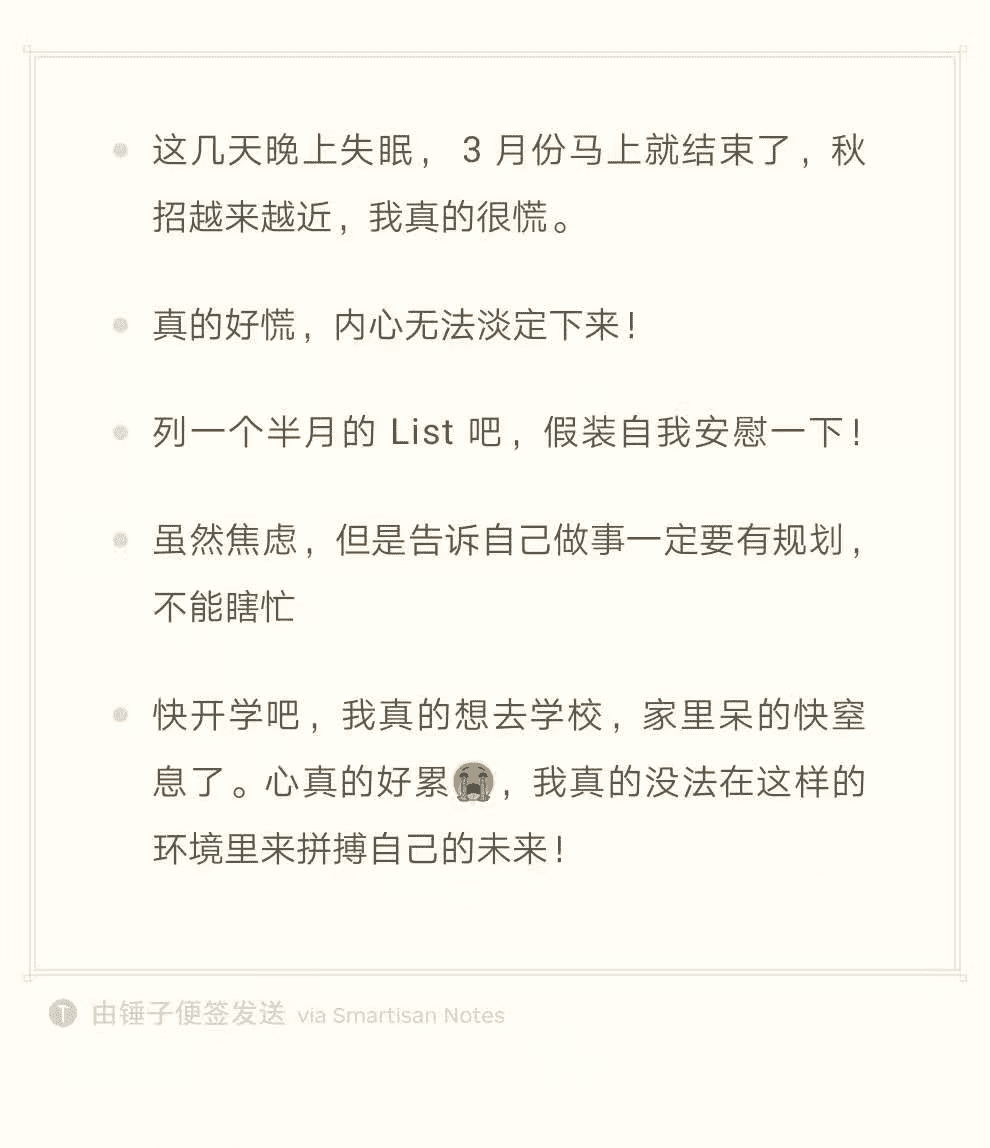 对比朋友每天大厂的实习日常,再看看自己的狼狈不堪。每天,整个人都有着巨大的心里压力和焦虑。学校在线的网课都是在后台静音放着,天天跑到教育厅下询问开学时间,“又是不开学的一天!哎,到底什么以后才能去学校呀!”。