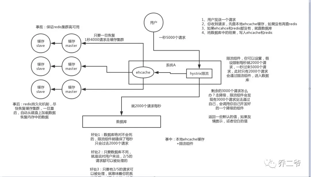 这种方案就是在发生雪崩前对缓存集群实现高可用,如果是使用 Redis,可以使用 主从+哨兵或者Redis Cluster 来避免 Redis 全盘崩溃的情况。