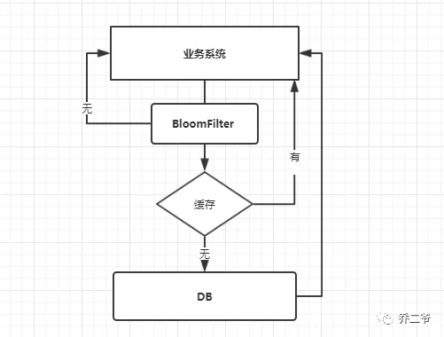将所有可能存在的数据哈希到一个足够大的bitmap中,一个一定不存在的数据会被这个bitmap拦截掉,从而避免了对底层存储系统的查询压力。在缓存之前在加一层 BloomFilter ,在查询的时候先去 BloomFilter 去查询 key 是否存在,如果不存在就直接返回,存在再走查缓存 -> 查 DB。流程如下: