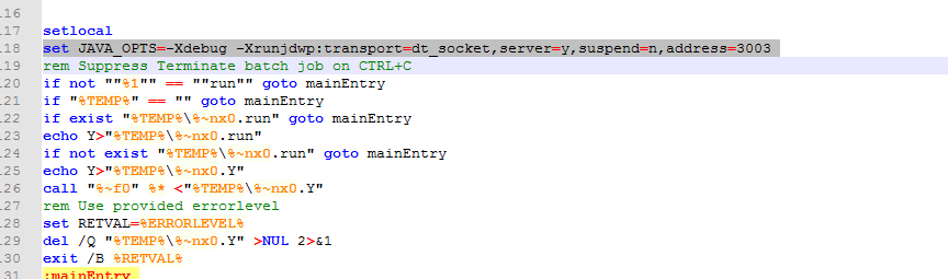 set JAVA_OPTS=-Xdebug -Xrunjdwp:transport=dt_socket,server=y,suspend=n,address=3003