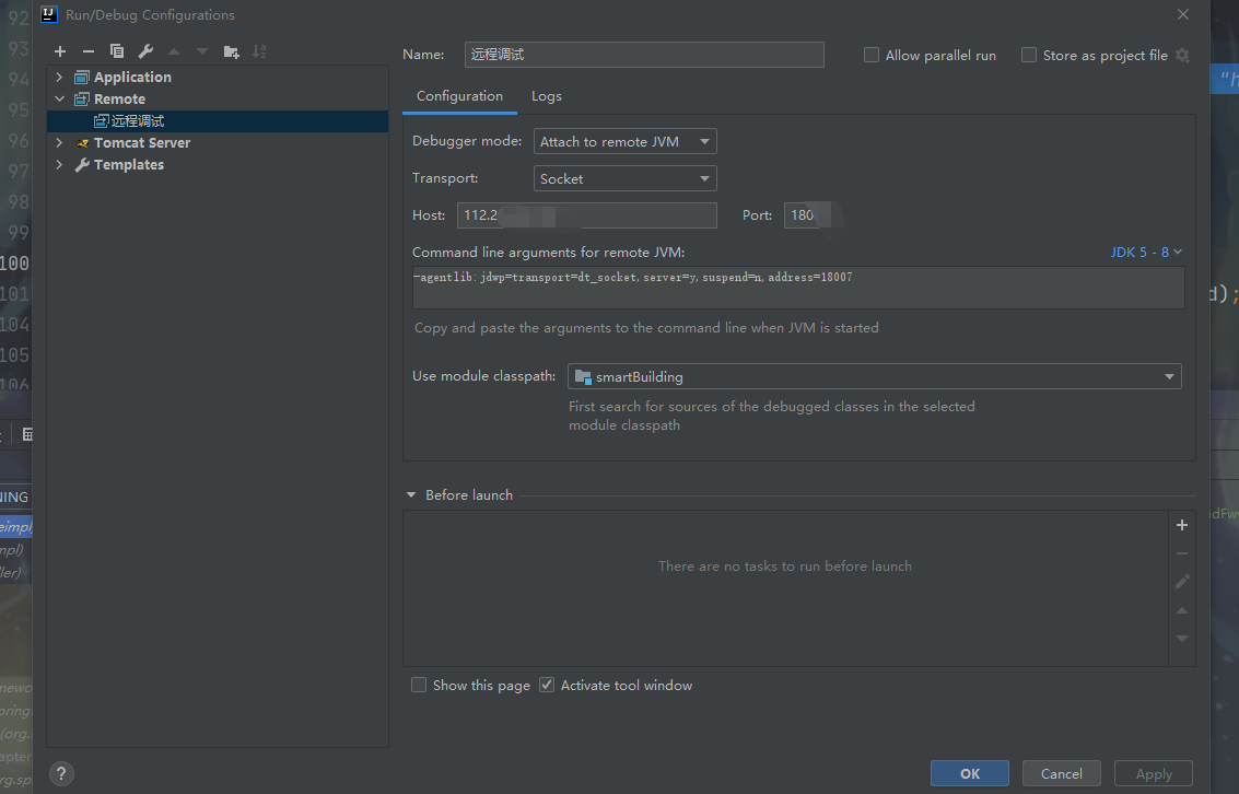3:配置idea的Remote,填上远程服务器的IP和端口(我这里是做了映射,一般情况也是和远程的端口是同样的)