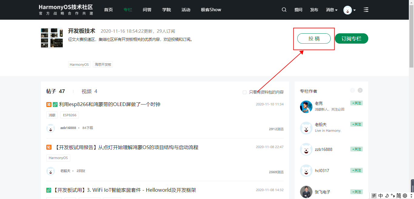 按自己的文章类型找到相应的专栏位置,点击“投稿”。