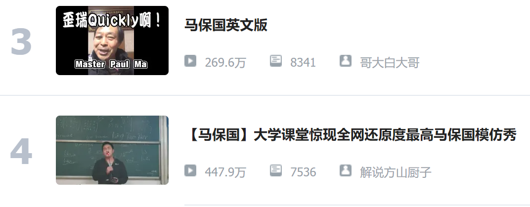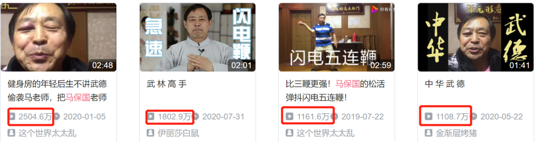 搜索马保国,B站视频前几位都是几千万的播放量,这个量级大概只有2019年的鸡你太美可以媲美。