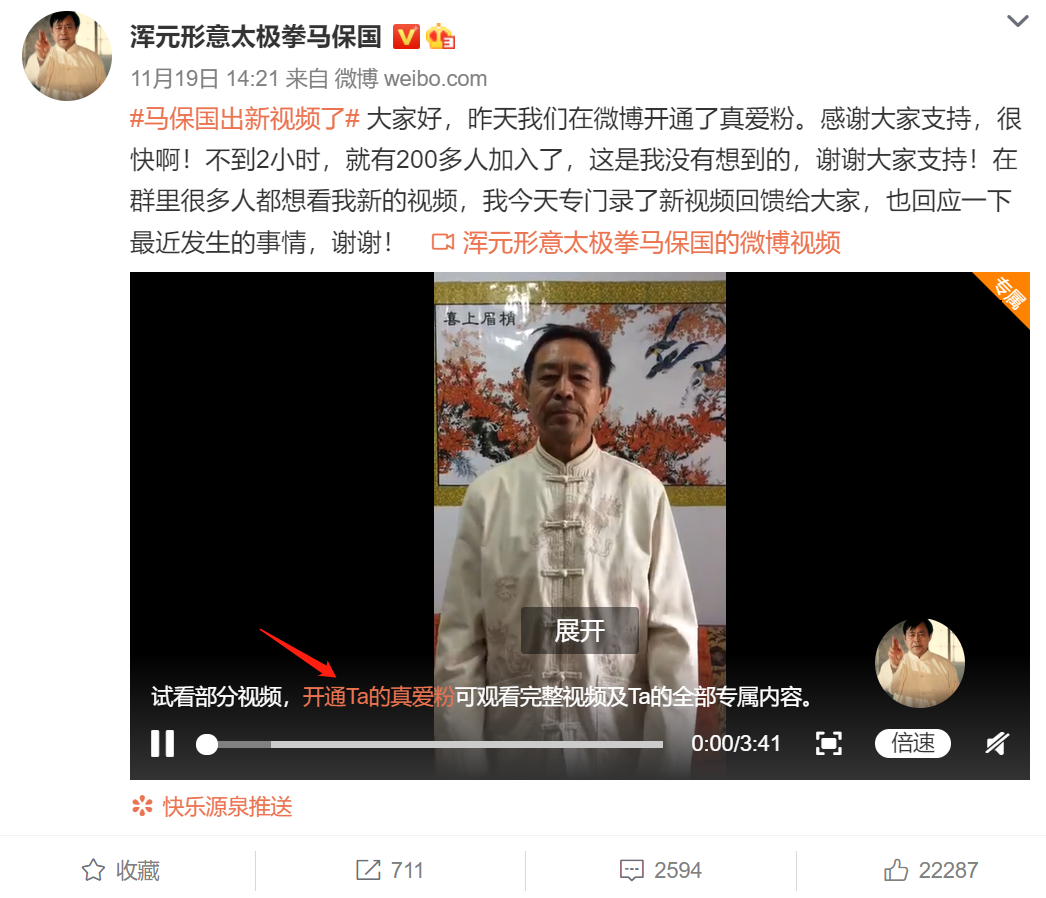 这次马老师显然是有备而来,该视频是一个付费视频,付费成为真爱粉才能观看完整版,不到2小时啪地一声就有200多人加入,而费用也从一个月 2.2元 涨到 15元,顶流无疑。