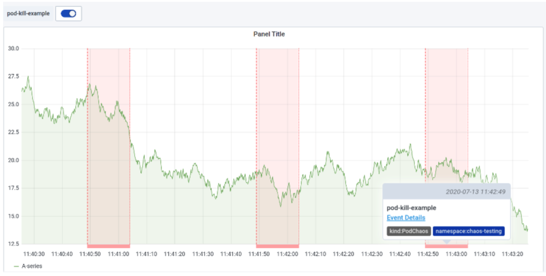 Chaos Mesh 为了进一步提高混沌实验的可观测性,单独开发了 Grafana 插件,方便用户直接将混沌实验的运行信息展示在自己的监控面板上。用户在 Grafana 上安装了此插件后,可以直接在应用的监控面板上开启混沌实验信息按钮,此时混沌实验的相关信息会以 Annotations 的方式在当前的面板上展示出来,这样用户就可以在一个界面上同时观察到应用的运行情况以及当前运行的混沌实验信息。