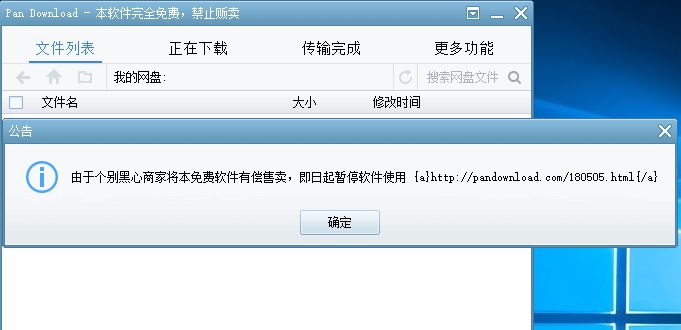 之前有人使用我曾经推荐过的百度网盘加速器Pan Download,最近跟我反馈,不能使用了,我赶紧去打开看一下,果真被作者关停了,一打开软件就提示:由于个别黑心商家将本免费软件有偿售卖,即日起暂停软件使用 。如下图:
