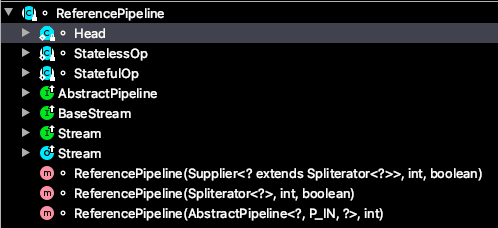 ReferencePipeline 是一个结构类,定义内部类组装了各种操作流,定义了Head、StatelessOp、StatefulOp三个内部类,实现了 BaseStream 与 Stream 的接口方法。