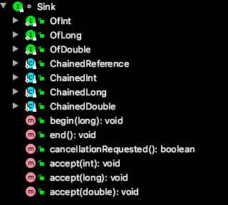 Sink 接口定义了 Stream 之间的操作行为,包含 begin()、end()、cancellationRequested()、accpt()四个方法。ReferencePipeline最终会将整个 Stream 流操作组装成一个调用链,而这条调用链上的各个 Stream 操作的上下关系就是通过 Sink 接口协议来定义实现的。