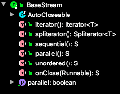 最顶端的接口类,定义了流的基本接口方法,最主要的方法为 spliterator、isParallel。