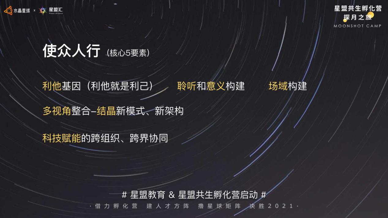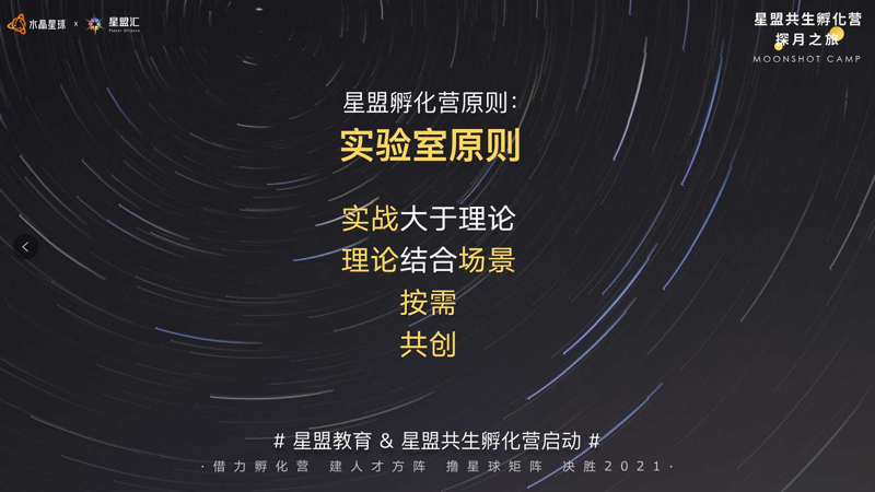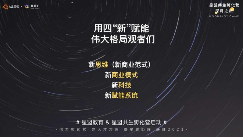 星盟共生孵化营,为人才而来。我们希望伟大格局观者和先行者们将身边的商业人才及潜在共创伙伴邀请进来,一同构建面向未来的分布式商业生态。