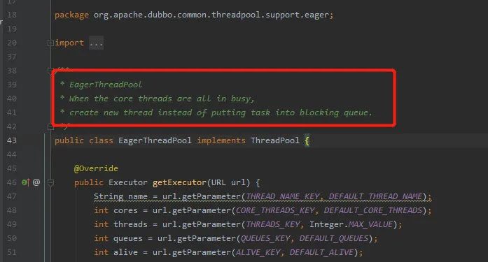 从注释里可以看出,如果核心线程都处于 busy 状态,如果有新的请求进来,EagerThreadPool 会选择先创建线程,而不是将其放入任务队列中,这样可以更快地响应这些请求。