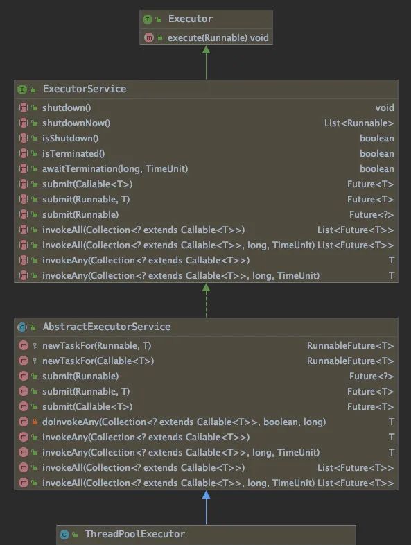 Executor: 最顶层的 Executor 接口只提供了一个 execute 接口,实现了提交任务与执行任务的解藕,这个方法是最核心的,也是我们源码剖析的重点,此方法最终是由 ThreadPoolExecutor 实现的, -