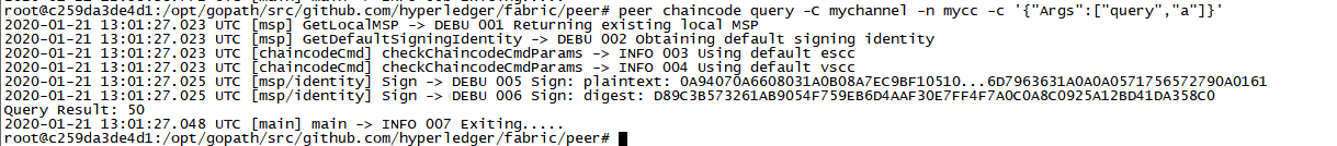 root@c259da3de4d1:/opt/gopath/src/github.com/hyperledger/fabric/peer# peer chaincode query -C mychannel -n mycc -c '{"Args":["query","a"]}'