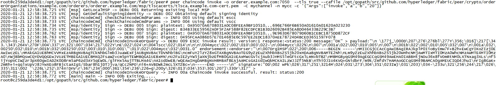 peer chaincode invoke -o orderer.example.com:7050 --tls true --cafile /opt/gopath/src/github.com/hyperledger/fabric/peer/crypto/ordererOrganizations/example.com/orderers/orderer.example.com/msp/tlscacerts/tlsca.example.com-cert.pem -C mychannel -n mycc -c '{"Args":["invoke","a","b","20"]}'