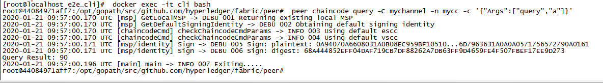 使用官方提供的小例子进行测试,在官方例子中,channel名字是mychannel,链码(智能合约)的名字是mycc。 首先要登录到CLI这个容器中,才能执行Fabric的CLI命令: