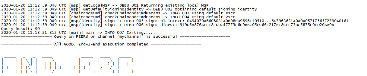 运行完如果出现下图所示,说明整个Fabric网络已经通了.