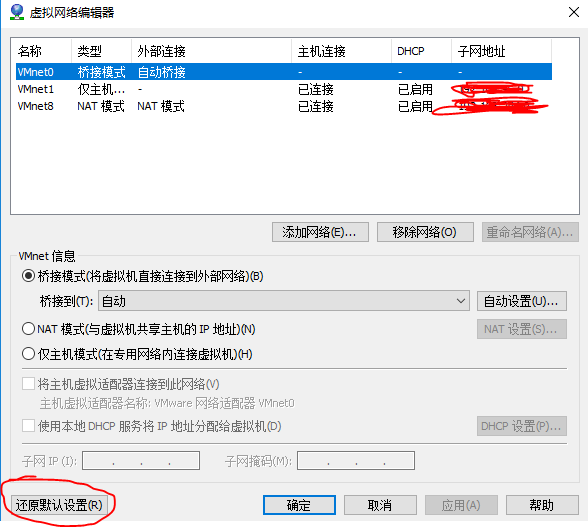 "编辑"-> "虚拟网络编辑器" ->" 还原默认设置"