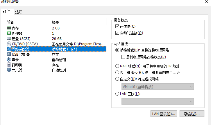 "虚拟机" -> "设置" -> "网络适配器" 选择桥接模式,并保存。