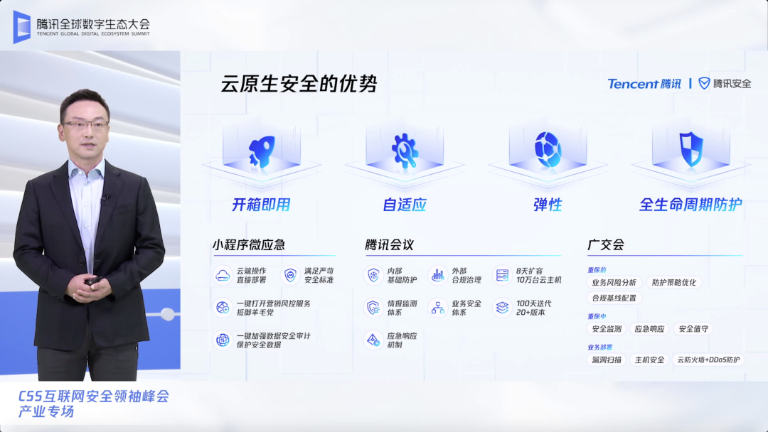 欢迎大家来到CSS互联网安全领袖峰会。今年的CSS和腾讯全球数字生态大会合并在一起,在云端举办。往年线下举办的峰会,极限也就容纳几万人,现在得益于云计算技术的发展和云基础设施的建设,我们突破了这个极限,可以几十万人在线开会。