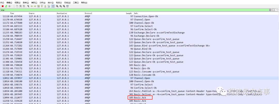 用抓包工具Wireshark 观察一下rabbitmq amqp协议交互的变化,也多了 ack 的过程。