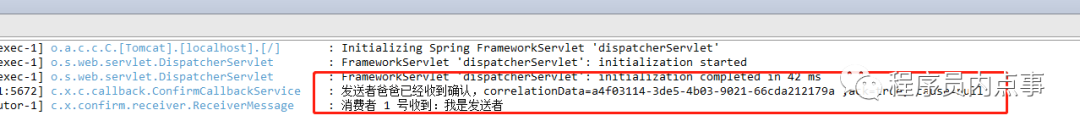发送消息测试一下消息确认机制是否生效,从执行结果上看发送者发消息后成功回调,消费端成功的消费了消息。