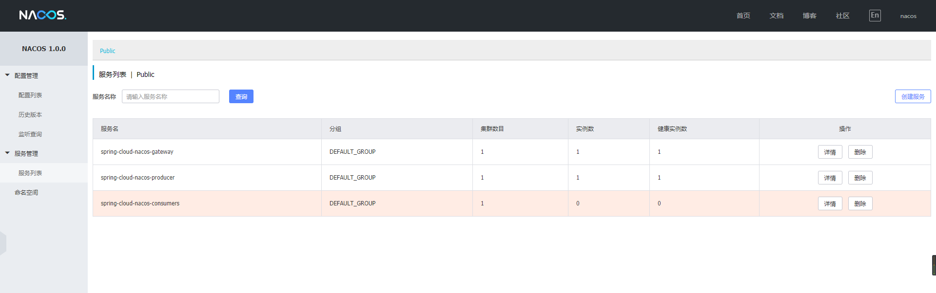 这里我把消费者服务停止掉了,可以看到Nacos可以实时的显示出来。