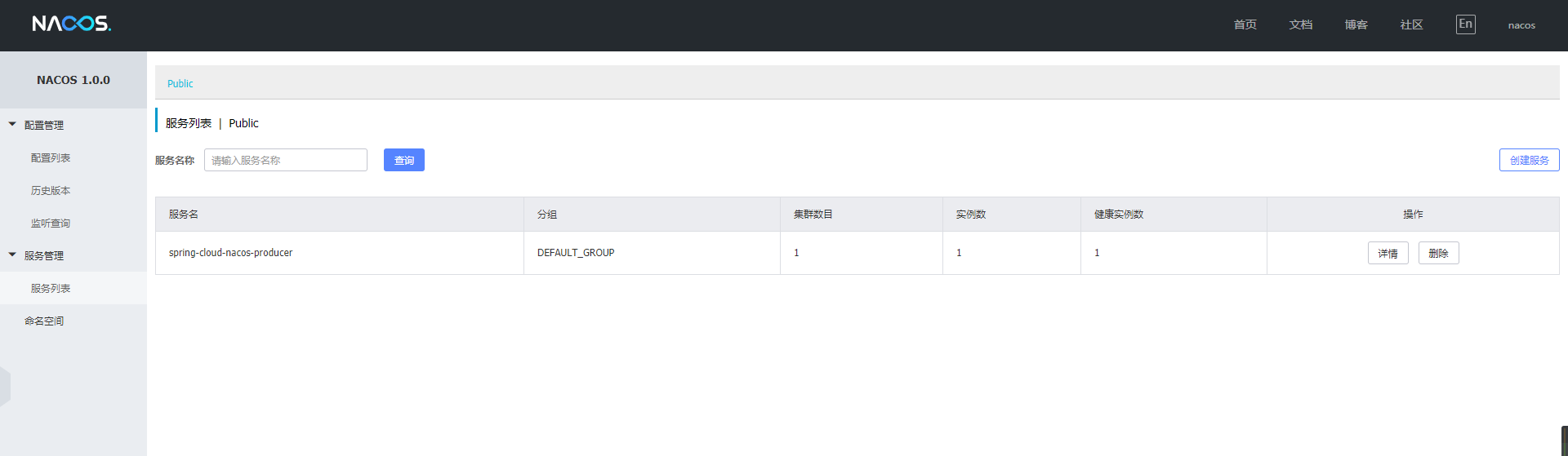 打开Nacos显示页面,可以看到服务spring-cloud-nacos-producer正常上线。