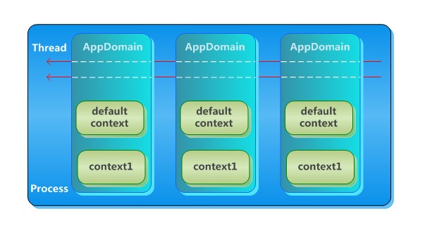 进程、应用程序域、线程的关系如下图,一个进程内可以包括多个应用程序域,也有包括多个线程,线程也可以穿梭于多个应用程序域当中。但在同一个时刻,线程只会处于一个应用程序域内。