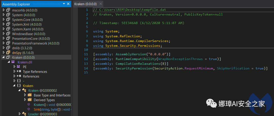 加载的Payload是一个名叫“ Kraken.dll”的.Net DLL,该文件编译于2020年06月12日。