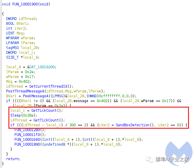 DllMain函数如上图所示,创建的线程首先执行一些反分析检查,以确保它不在分析/沙箱环境或调试器中运行,它通过以下操作来实现的。