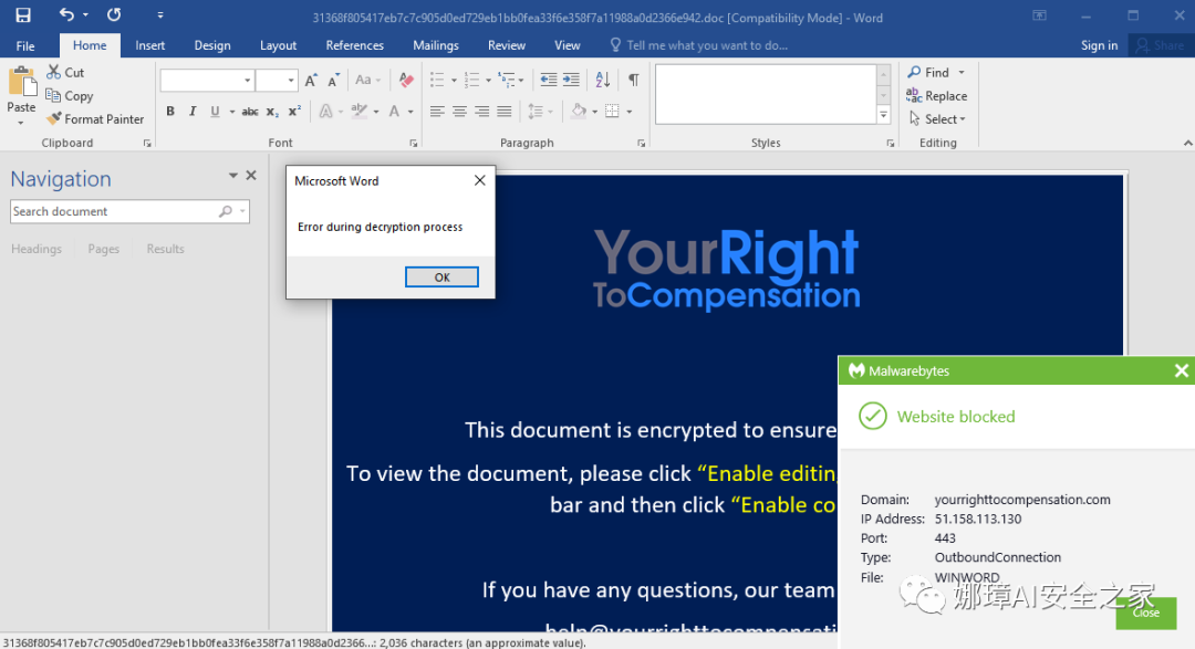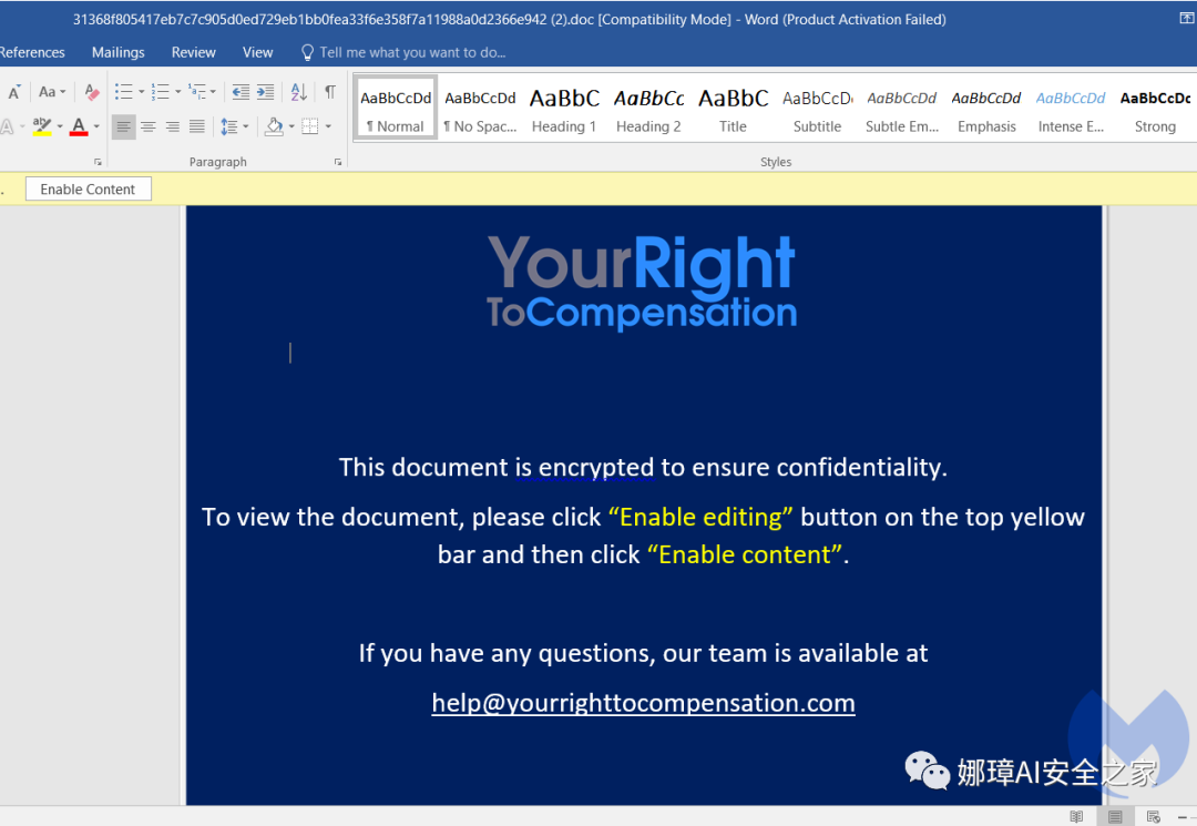 9月17日,我们发现了一种新型攻击,该攻击从一个包含恶意文档的zip文件开始,该文档很可能是通过鱼叉式网络钓鱼攻击传播的。文档名叫“薪酬手册”(Compensation manual.doc),伪装成包含有关工人补偿权利的信息,文档如下图所示。