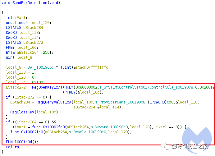 在此函数中,它将通过提取显示驱动程序注册表项的提供程序名称来检查其是否在VMWare或VirtualBox中运行。
