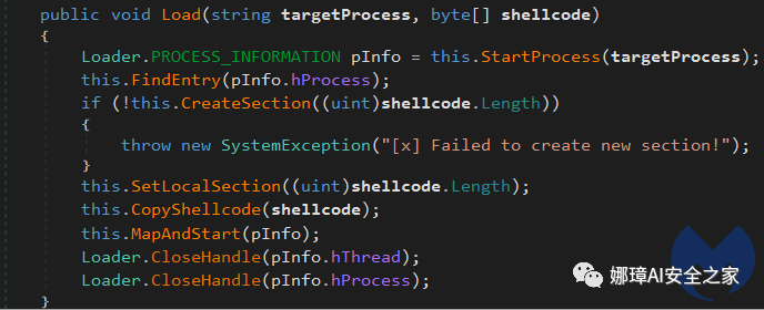 Loader类负责通过调用Windows API将shell代码注入到目标进程中。下图展示了load函数。
