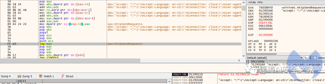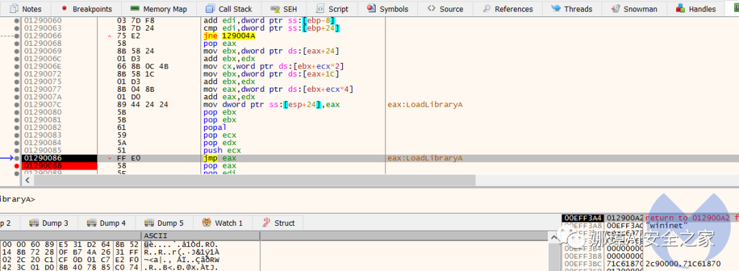 第一步,它通过调用LoadLibraryA加载Wininet API。