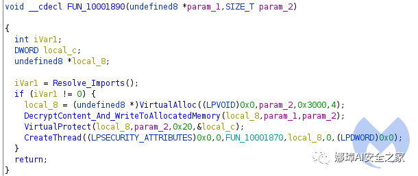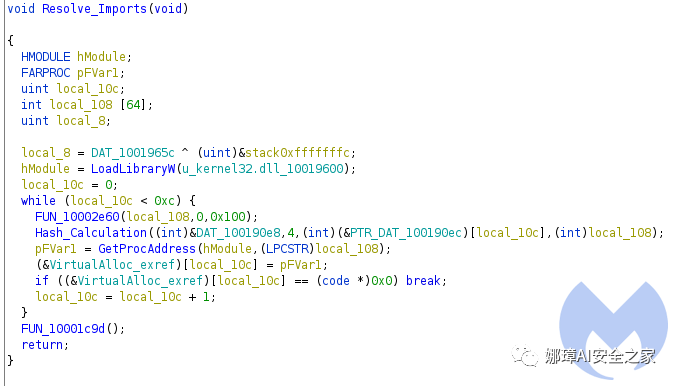在执行所有这些反分析检查之后,它进入一个函数,在一个新线程中创建最终的shellcode。通过调用“ Resolve_Imports”函数,可以动态混淆并解析在此部分中使用的导入调用。此函数使用LoadLibraryEx获取“kernel32.dll”的地址,然后在循环中检索12个导入。