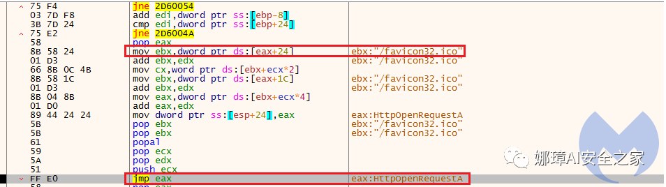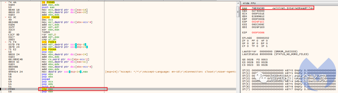最后,它跳转到已分配内存的开头以执行它。这很有可能是另一个受感染的“asia-kotoba.net”网站上托管的shellcode,并在其中植入了伪造的图标。由于在报告时目标URL已关闭,因此我们无法检索此Shellcode进行进一步分析。