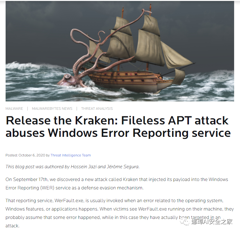 原文标题:Release the Kraken: Fileless APT attack abuses WindowsError Reporting service原文链接:https://blog.malwarebytes.com/malwarebytes-news/2020/10/kraken-attack-abuses-wer-service/文章作者:Hossein Jazi&Jérôme Segura发布时间:2020年10月6日文章来源:Malwarebytes