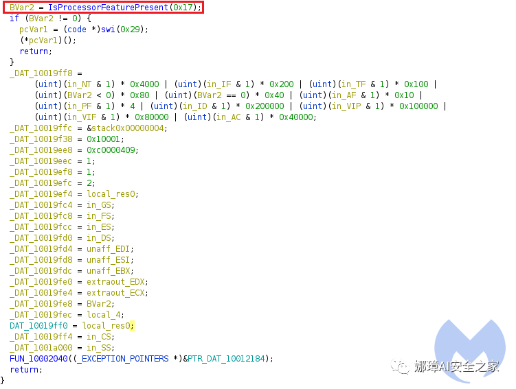此API调用用于确定是否支持指定的处理器特性。从下图可以看出,“ 0x17”已作为参数传递给此API,这意味着它在立即终止之前检查剩余的__fastfail支持。