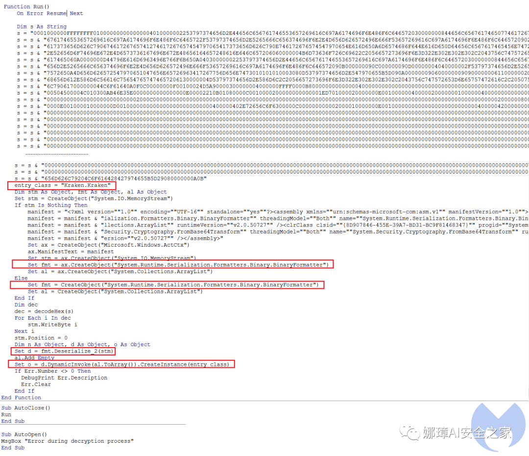 如上图所示,已经定义了一个十六进制格式的序列化对象,它包含一个正在加载到内存中的.Net有效负载(Payload)。然后,宏使用“ Kraken.Kraken”作为值定义了一个入口类。这个值有两个部分,用一个点分隔.net加载器的名称和它目标类的名称。