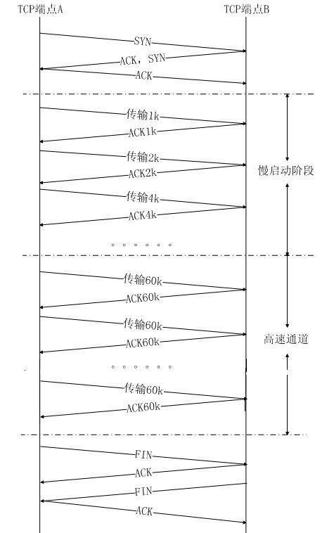 对方确认的过程中去计算对方的接收速度,来逐步增加每次发送的数据量(最后到达一个稳定的值,进入高速传输阶段。相应的,慢启动过程中,TCP通道处在低速传输阶段),