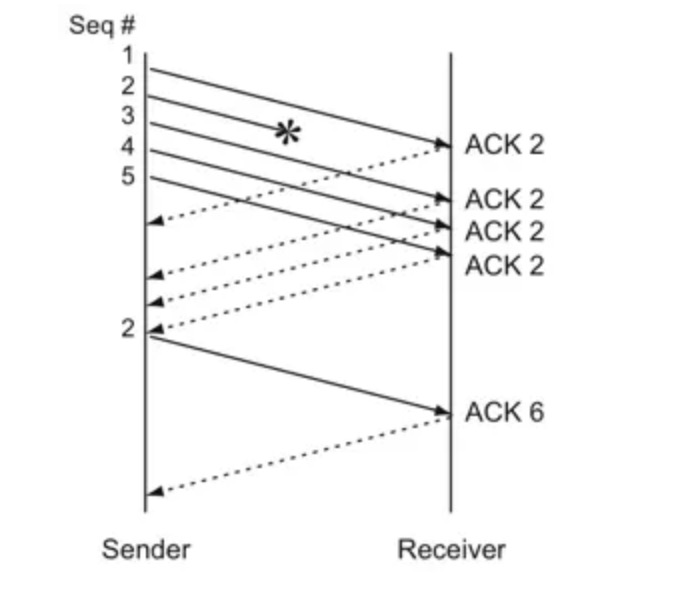 因为2还是没有收到,于是发送端收到了三个ack=2的确认,知道了2还没有到,于是就马上重转2。然后,接收端收到了2,此时因为3,4,5都收到了,于是ack回6。示意图如下