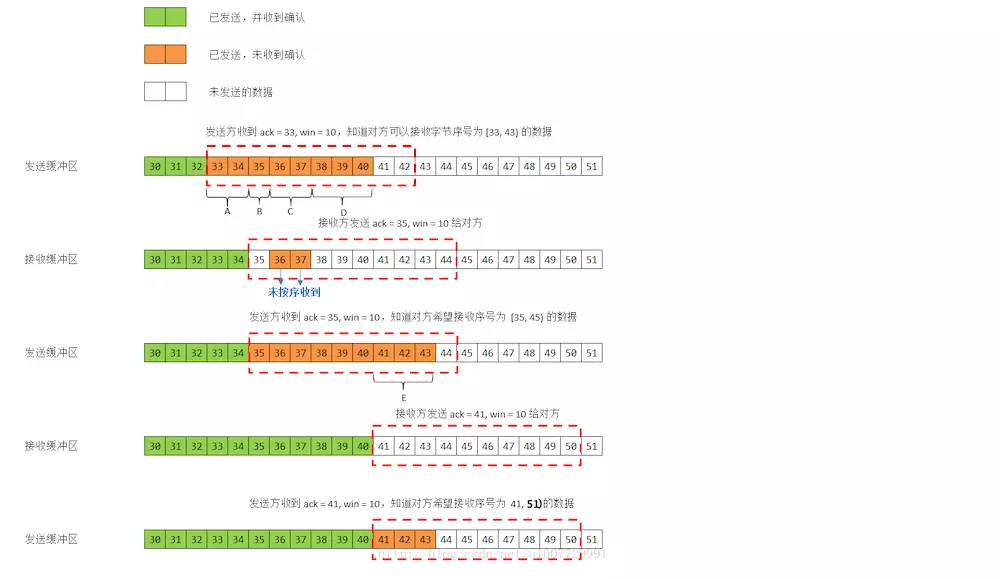 3、发送方收到了 ack = 35, win = 10,对方期望接收 [35, 45) 号数据。那么发送方在发送[35, 45) 。