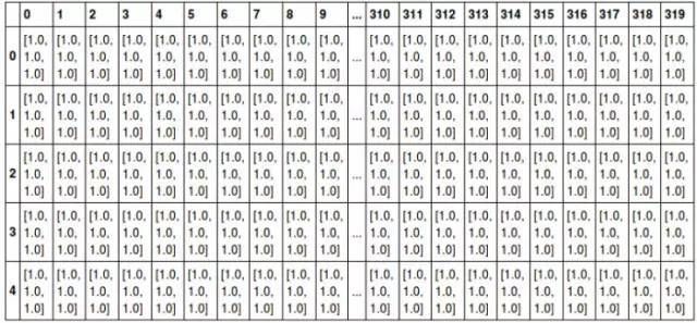 其中表的横轴表示图片的宽度值,这里只截取0~319;表的纵轴表示图片的高度值,这里只截取0~4;表格中每个方格代表一个像素点,比如第一行第一列的表格数据为[1.0,1.0,1.0],代表的就是RGB三原色在图片的这个位置的取值情况(即R=1.0,G=1.0,B=1.0)。