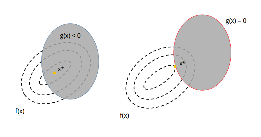 对于该定义的直观解释见下图: 灰色部分为约束 $g(\boldsymbol{x}) \leqslant 0$ 的可行域,若最优点 $\boldsymbol{x}^*$ 在区域内 (下左图,$g(\boldsymbol{x}) < 0$ ) ,则约束并没有起到”约束的作用“,这样可直接通过 $\nabla f(\boldsymbol{x}) = 0$ 来获得最优点,这等价于让 $(1.1)$ 式中 $\lambda = 0$ 。