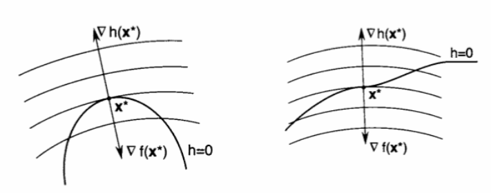 <font size=2> (2). 对于 $f(\boldsymbol{x})$ 的极小点 $\boldsymbol{x}^$ ,$h(\boldsymbol{x})$ 在 $\boldsymbol{x}^$ 处的梯度 $\nabla h(\boldsymbol{x}^*)$ 与 $h(\boldsymbol{x}) = 0$ 的切线方向垂直 </font> <br> 对于第 (2) 点,可作如下证明: 设 $\boldsymbol{x}(t)$ 为连续可微的函数,则有 $h(\boldsymbol{x}(t)) = 0$ ,利用链式法则: $$ \frac{\text{d}}{\text{d} t} h(\boldsymbol{x}(t)) = \nabla h(\boldsymbol{x}(t)) \cdot \frac{\text{d}{\boldsymbol{x}(t)}}{\text{d}t} = 0 $$ $\frac{\text{d}{\boldsymbol{x}(t)}}{\text{d}t}$ 即为切线方向,所以本质上 $h(\boldsymbol{x}) = 0$ 上任意一点的梯度 $\nabla h(\boldsymbol{x})$ 都与其正交,$\boldsymbol{x}^$ 自然也不例外。 <br> 于是可以得出在极小点处 $\nabla h(\boldsymbol{x}^)$ 与 $\nabla f(\boldsymbol{x}^)$ 平行,即存在 $\lambda \neq 0$ ,使得: $$ \nabla f(\boldsymbol{x}^) + \lambda \nabla h(\boldsymbol{x}^*) = 0 \tag{1.1} $$ $\lambda$ 被称为拉格朗日乘子,下面定义拉格朗日函数: $$ \mathcal{L}(\boldsymbol{x}, \lambda) = f(\boldsymbol{x}) + \lambda ,h(\boldsymbol{x}) \tag{1.2} $$ 将上式分别对 $\boldsymbol{x}$ 和 $\lambda$ 求导置零,就分别得到 $(1.1)$ 式和等式约束 $h(\boldsymbol{x}) = 0$ ,这样就将原约束优化问题转化为对 $\mathcal{L}(\boldsymbol{x}, \lambda)$ 的无约束优化问题。 然而这个方法找出来的平稳点不一定都是原问题的极值点,如下左图是一个极值点,而下右图却不是极值点。