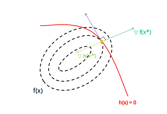 由于相交的两个黄色点不是极小点,梯度 $\nabla f(x_1)$ 仍然会沿着 $h(x) = 0$ 变化,因而在这两个点 $\nabla f(x_1)$ 不与 $h(x) = 0$ 的切线方向垂直,只有在极小点才会正交。 <br> 由此可以得出两个推论 (见下图):