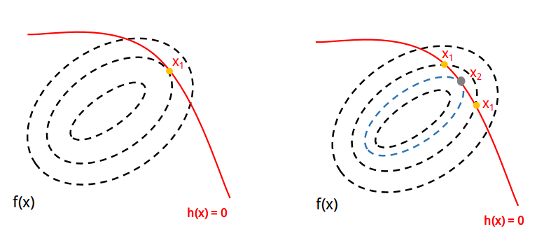 下面画图来直观理解拉格朗日乘子法,先看下左图: 黑色虚线为函数 $f(x)$ 的等值线,红色实线为约束条件 $h(x) = 0$ ,这里的关键是 $f(x)$ 在极小点处必然与 $h(x) = 0$ 相切,如下左图相切于黄色点 $x_1$ 。为什么这么说?来看下右图: 如果 $f(x)$ 与 $h(x) = 0$ 不相切,则相交于两个黄色点,而由于 $x$ 是连续的,则必然能找到一个新的 $x_2$ 使得 $f(x_2)$ 更小,图中表示为蓝色虚线,使得在 $x_2$ 处 $f(x)$ 与 $h(x) = 0$ 相切。