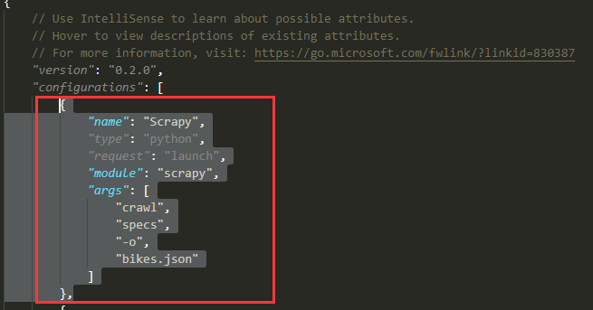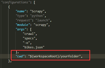 - 此时按F5调试, 如果报“Unknown command: crawl”错误,则需要在launch.json的scrapy中增加 "cwd"参数, 设置路径为爬虫项目名目录,一般都在scrapy下的一级