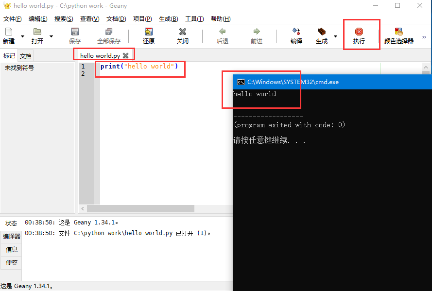 注:这里不需要修改geany的任何配置,直接写程序即可,编译环境会自动生成。程序起名字的时候需带上后缀.py,否则不能识别运行。